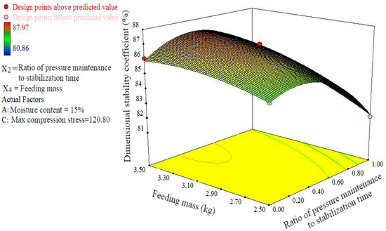 The interaction between the ratio of pressure maintenance time to stabilization time and feeding mass affected the dimensional stability (Figure 5).When the ratio of pressure maintenance time to stabilization time was constant, the dimensional stability coefficient increased with the increment of feeding mass. The feeding mass affected the compression displacement of straws and the rebounding displacement after compression. When the feeding mass increased, both increased, but the magnitude of compression displacement was very large, so the dimensional stability coefficient increased. When the feeding mass was constant, as the ratio of pressure maintenance time to stabilization time increased, the dimensional stability coefficient of pressed straws first increased, then optimized, and finally decreased. The reason was that pressure maintenance and strain maintenance both can intensify the dimensional stability of pressed straws, but the mechanisms are different. During strain maintenance, the rebounding of pressed straws is relieved through the relaxation of residual stress, so as to enhance the dimensional stability of pressed straws. On the contrary, during pressure maintenance, the above goal is achieved by enlarging the compression displacement, but the stress is not relaxed and instead is converted into the rebounding force of pressed straws, so the rebounding is enlarged. During pressure maintenance, the compression displacement is large at the early stage, but it declines with the prolonging of time [47,59]. At the early stage of strain maintenance, the stress relaxation is large, but it declines with the extension of time [4,54,55]. Thus, the combination of pressure maintenance and strain maintenance can significantly enhance the dimensional stability of pressed straws.