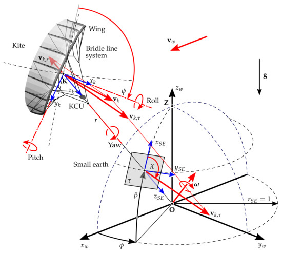 To describe the flight motion of the kite power system, we introduce the wind reference frame (), the kite reference frame (), and the small earth reference frame (), as illustrated in Figure 3.