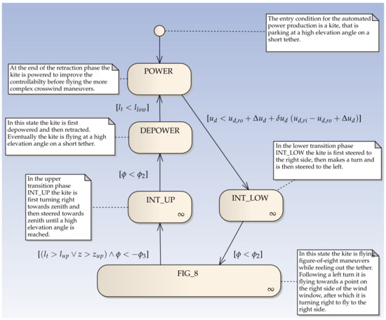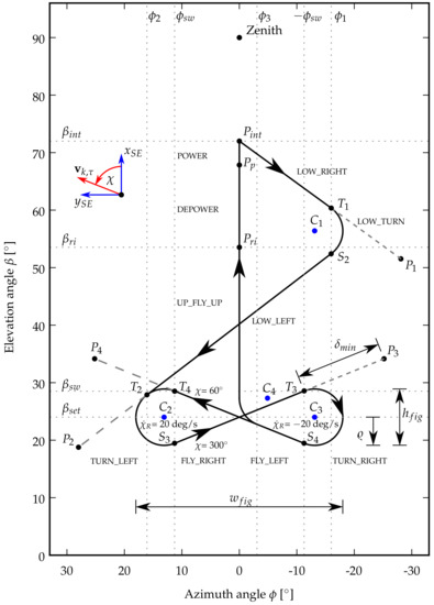 The purpose of the FPP is to design a suitable flight trajectory for a pumping cycle. The path is constructed in the - space as a sequence of connected line segments on the small earth. As consequence, a finite state diagram can be used to describe the flight control of the kite. The states of the high-level controller required for automated power production are explained in Figure 4 and Figure 5. For the remainder of this paper, our focus is on the figure-of-eight maneuvers during the traction phase.