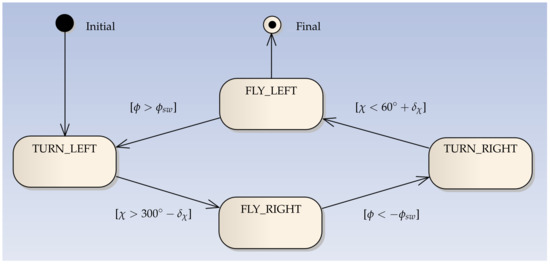 The downloop flight maneuvers are (we distinguish between downloops and uploops depending on the direction of flight during the turning maneuvers along the outer parts of the figure of eight. While downloops lead to a more equalized power profile during the traction phase, uploops are generally considered to be more safe) flight maneuvers are constructed in four steps, as shown in Table 1 and Figure 6. The flight maneuver starts from the initial position of the kite with a left turn (substate TURN_LEFT). During the turn, the set value , computed from theturn rate law given by Equation (8), is used. When reaching the switch condition , the turning maneuver is stopped, and the kite starts flying to the right towards attractor point (substate FLY_RIGHT). On this segment of the figure of eight, the kite is steered by the PID controller, as described in Section 2.3. A relatively large offset of is needed to compensate for the time delay s between the command to stop turning and the kite actually stopping to turn [12]. For clarity of illustration, we use a value of in Figure 4 and Figure 7a, such that the circular-path segments with constant turn rate directly connect with the straight-path segments with constant course angle . When reaching the switch condition , the kite starts a right turn (substate TURN_RIGHT). During the turn, the set value computed from the turn rate law is used. When reaching the switch condition , the turning maneuver is stopped, and the kite starts flying to the left towards attractor point (substate FLY_LEFT). On this segment of the figure of eight, the kite is again steered by the PID controller. When reaching the switch condition , a new figure-of-eight maneuver is started with the kite entering a left turn (substate TURN_LEFT).