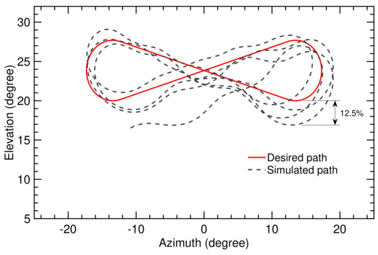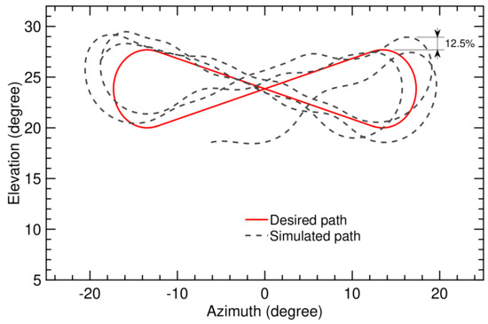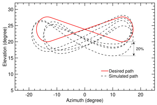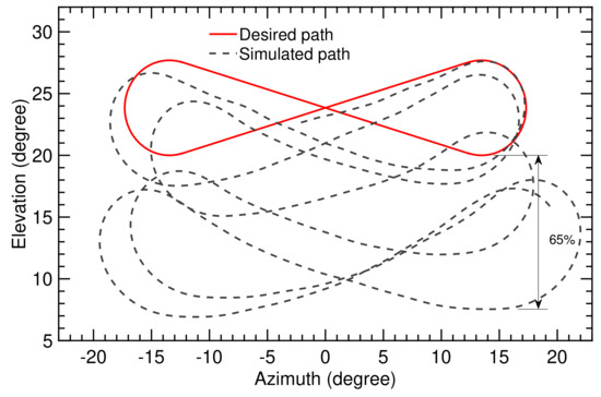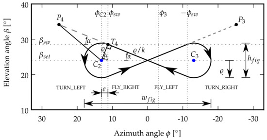 As illustrated in Figure 4, the geometry of the figure-of-eight flight path is defined by the angular width and height , and the minimal attractor point distance , which is defined as the arc length on the unit sphere between the kite position and the current attractor point, at which the kite stops flying towards this attractor point and starts to make a turn. If the aforementioned parameters are specified, then , , and can be calculated by the FPP. The motion of the kite on the planned trajectory is described by the tangential velocity of the kite , defined by Equation (2), and the turning radius, defined as