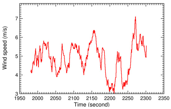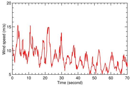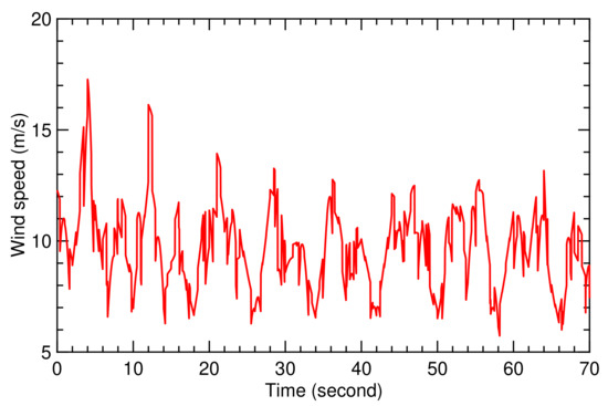 In this section, we present simulation results using the model and algorithms described in Section 2, Section 3 and Section 4. We compared the results of a classical (PID) controller implemented in [12] with the adaptive control demonstrated in Section 4 to show the capability of the adaptive control to increase the stability of the kite flight. Both controllers use the simplified kite model derived in Section 2. We investigated the flight dynamic responses of the kite for the two wind speed signals shown in Figure 9 and Figure 10. Flight condition I is discussed in Section 5.1, while flight condition II, which is characterized by a much higher frequency, is discussed in Section 5.2.