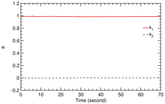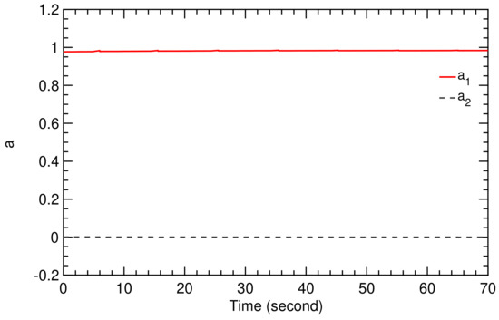 The SI algorithm predicts the course angle and updates the coefficients and of the open-loop TF. Following that, the adaptive control updates its gains to stabilize the kite, as described in Section 4. The simulation results presented in Section 5 were calculated on the basis of the SI algorithm. This required to get the values of the control action and kite course angle as input for the algorithm to estimate the coefficients and for two different flight conditions. Finally, these simulation results were compared with results of the simplified model using a PID controller.