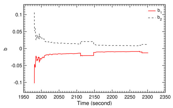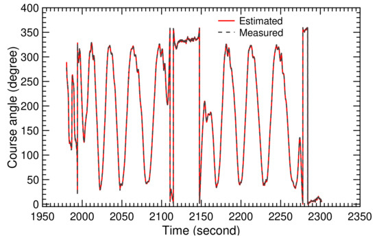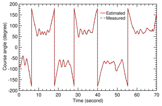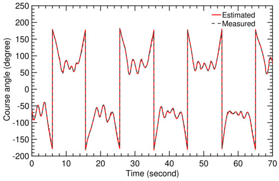 Thus, the unknown coefficients and have to be calculated in every time step as to update the estimated course angle given in Equation (26). The following calculation steps are required to obtain these parameters. First, the matrix is initialized with large positive numbers on the leading diagonal and zeroes on the off-diagonal elements. The matrix must be populated with initial parameters close to the model. Then, the simulation results of the SI algorithm are obtained with the following steps: