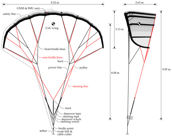 Several mathematical models have been developed to describe the dynamic behavior of a kite system [1,3,10,11]. Obvious shortcomings of these models are the numerous idealizations that limit the achievable prediction quality for a flight trajectory in a real wind environment, which is characterized by local changes in wind speed and direction occurring within seconds [12,13]. Another modeling challenge is the aeroelastic response of the membrane wing because substantial deformations also majorly affect the aerodynamic properties of the kite system [14,15,16].