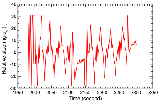 The kite is steered along the turns of the figure-of-eight maneuver using a feed-forward controller with the set value , computed from the turn rate law given by Equation (8), to fly a turn with radius R (or in - space). This set value is used as input of a nonlinear-dynamic-inversion (NDI) block to calculate the relative steering action that is required to fly the respective turn. The functions used by the NDI block are detailed in [12].