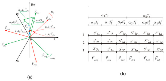 Synthesis of output voltage during Ts switching period: (a) Summation of the input voltage rotating voltage space vectors; (b) switch duty cycles.