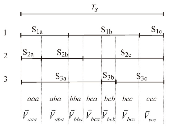Synthesis of the output voltage space vector according to Equation (18) is shown in Figure 2a. When applying carrier based modulation to realize proposed modulation strategy it should be assumed, that each Ts switching period is divided into two parts in proportion to values of and coefficients. Switch duty cycles, determined by means of modulation functions being the elements of and matrices, are arranged within Ts switching period in the sequence: , , , , , (Figure 2b). A block diagram of the implementation of the proposed modulation strategy, presenting signal flow for three switches connected to the output phase number 1, is shown in Figure 3.