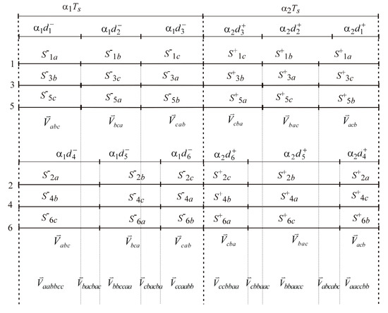 The block diagram of the proposed carrier based modulation realizing voltage at the output phase number “1” is almost the same as in Figure 3, with the difference that the modulation functions (20) and (21) are taken instead of the functions (13) and (14). The switch duty cycles arrangement, resulting in elimination of the CMV, for the switching period Ts and for the six output phases is shown in Figure 5. It could be noted in Figure 4 that the output voltages of three of six phases: 1, 3 and 5 or 2, 4 and 6 correspond to appropriate rotating space vectors , , and , , . Taking into account six output phases, the voltages of these phases correspond to vectors recorded as: . The letters in the label xxxxxx in the name of the space vector means the names of input phases connected into output phase 1, 2, 3, 4, 5 and 6, respectively. The vectors representing output voltages of all three-to-six-phase MC configurations which realize elimination of the CMV are shown in Table 2. The voltage space vectors, presented in Table 2, are divided in three groups. Two of them consist of the CCW and CW rotating voltage space vectors, that are characterized by the same module value equal 0.866Ui. The third group in Table 2 are zero vectors whose module is equal to zero [25].