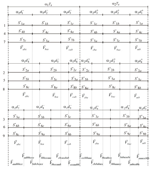 Similarly to the modulation functions discussed previously in the Section 3.1 and Section 3.2, Venturini modulation functions (24) and (25) applied to control the three-to-nine-phase MC, have the property that they are the same for three of nine switches. This allows the arrangement of switch duty cycles to be used in the Ts period in a manner analogous to those considered in application to the three-to-three-phase and three-to-six-phase MC (Figure 6). The Ts switching period is divided into two parts depending on values of and parameters, which define the referenced input displacement angle. The application of the proposed arrangement of switch duty cycles is consistent with the relationship (26).