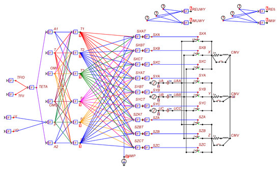 Taking into account the expressions (4)–(9) in the application of three-to-three-phase MC, it should be seen that among nine modulation functions of the matrix, there are three three-element groups within which the modulation functions are equal to each other (13). The same observation can be made when considering the matrix (14). The matrix M has the form (15) and the phase output voltages (16). For each output phase, the sum of switch duty cycles must be equal to one, so the modulation functions for these switches must meet condition (17).