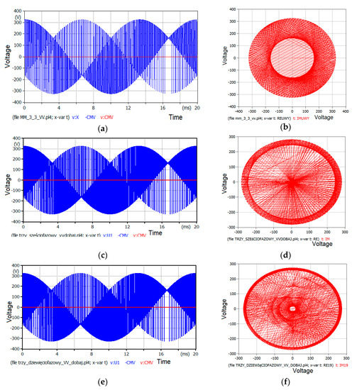 The simulation results regarding the problem of CMV elimination in the considered MCs are shown in Figure 8. The waveforms of output phase voltage and waveforms of CMV are shown in the parts (a), (c) and (e) of the mentioned figure for three-to-three-phase MC, for three-to-six-phase MC, for three-to-nine-phase MC, respectively. The instantaneous values of phase output voltages are equal to the instantaneous values of the input phase voltages. As can be seen, the CMV received in simulation tests equals zero in each of three-to-n-phase MC. The zero value of CMV results from the fact that the output voltage is synthesized by usage of rotating voltage space vectors, seen in parts (b), (d) and (f) of Figure 8, where the space vector trajectories are circular. The three-to-three-phase MC (Figure 8b) may be seen switching between only rotating space vectors having the same modules equal the amplitude Ui of input phase voltage. Rotating space vectors with two values of the modules are used to synthesize the output voltage in three-to-six-phase MC: First value, equal to 0.865 of the input phase voltage amplitude Ui and; second value, equal to zero value, seen in Figure 8d. The trajectory of the output voltage space vectors in three-to-nine-phase MC (Figure 8e) is shaped by the rotating space vectors having three different values of the modules: 0.2993Ui; 0.449Ui and 0.844Ui.