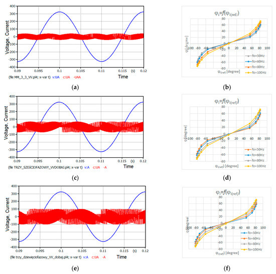 The results of simulations involved in testing the possibility to control the input displacement angle are shown in Figure 9: for three-to-three-phase MC (Figure 9a,b); for three-to-six-phase MC (Figure 9c,d); and for the three-to-nine-phase MC (Figure 9e,f). In the parts (a), (c) and (e) of Figure 9, the input phase voltages and input MC currents are shown. The parts (b), (d) and (f) of Figure 9 depict the input displacement angle versus referenced input displacement angle. The values of the displacement angle are determined between input voltage and fundamental component of the current. As could be noticed in each of the three figures, implementation of the Venturini modulation functions into modulation method causes the dependence of the input displacement angle on the referenced value of this angle to have a shape approximately corresponding to the function tangent, which is consistent with the analytical description of the modulation method. A positive value of the input displacement angle means that the fundamental harmonic of input current is lagging. For a negative value of this angle, the fundamental harmonic of input current has leading nature.