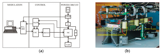 The measurements were carried out on the laboratory model of three-to-three-phase matrix converter system, the diagram can be divided into three main parts (Figure 10a): The power circuit, the control, and the modulation. The power circuit of the matrix converter consists of a matrix of nine bidirectional MC switches, an input filter Fi, and an overvoltage protection circuit PP. In the MC matrix (Figure 10b), three switches realizing connection of one of the three output phases with three input phases are grouped in a single integrated circuit EPM 25-D 00112, which is a modification of BSM 25 GD 120 DN2 circuit manufactured by Siemens, made by order of Danfoss-Drives A/S. The PWM control realizes synthesis of required output voltage and input current waveforms, together with setting the phase shift between first harmonic of input current and respective input voltage. At the design stage, the necessity to examine various PWM methods was anticipated, therefore the PWM signals were software-generated and transmitted to the control system by means of the PCL–1800 I/O board. The proper commutation process, ensuring fulfillment of fundamental requirement concerning avoidance of shortening voltage sources, or input phases, and currents sources, or inductance-type load phases, is realized in the electronic part of the control in the form of four-step commutation with load phase currents direction control. In Table 5, values of parameters used in the measurement test are shown.