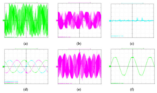 Waveforms registered in three-to-three-phase MC: output line-line voltage (a); output phase voltage (b); CMV (c); output currents (d); input current (e); input phase voltage (f).