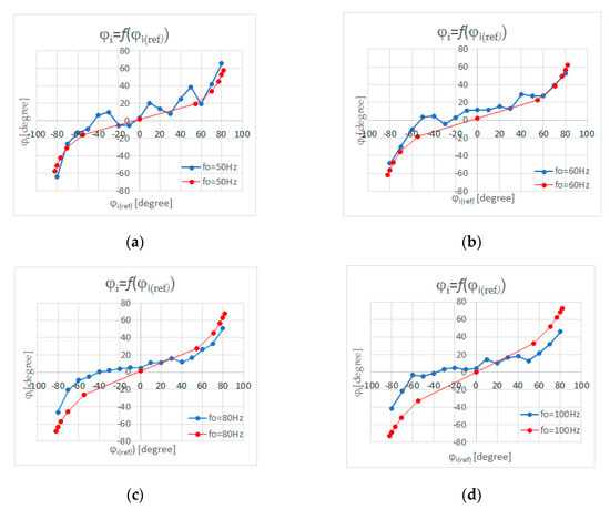 Input displacement angle in the function of referenced input displacement angles for different values of output frequency in three-to-nine-phase MC: Results of simulation (red line); result of measurements (blue line). (a): fo = 50 Hz; (b): fo = 60 Hz; (c): fo = 80 Hz; (d): fo = 100 Hz.