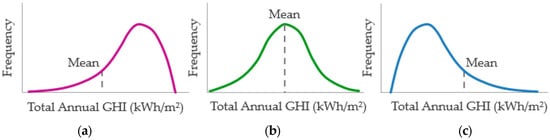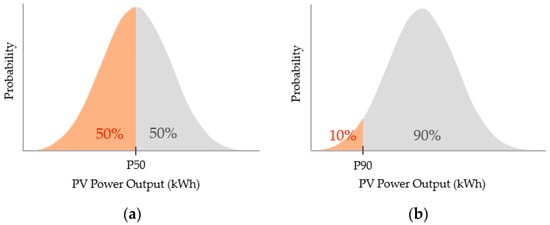 The variation of annual performance in solar energy systems is the essential factor considered in a project’s economic feasibility [1]. The risk evaluation of P50/P90 is mainly used to evaluate the economic feasibility of wind farm projects. Since solar irradiance is a more predictable resource than wind velocity, it can be applied to risk evaluations of photovoltaic (PV) or concentrated solar thermal power projects [2,3].