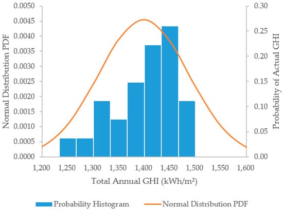 For PV system, which is widely used as a simulation program of solar energy systems [4], annual solar irradiance is assumed to follow the normal distribution in the P50/P90 calculation [5]. With the system advisor model (SAM) algorithm, two methods are used. Depending on whether or not the solar irradiance data distribution follows the normal distribution, P50/P90 is calculated from the cumulative distribution function (CDF) of the normal distribution if the solar irradiance data follow the normal distribution. Otherwise, P50/P90 is calculated from the empirical CDF, based on the assumption that all data occurrence probabilities are the same, by sorting the data in ascending order [3]. Furthermore, the results of a study performed in Spain, which exhibited the characteristics of annual global horizontal irradiance (GHI) in 13 locations in the USA, Europe, etc., reported that they followed the normal distribution [6].
