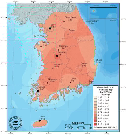 As shown in Table 1, the average GHI value from 9 a.m. to 5 p.m. during the period 1991–2017 was calculated, and the result showed that the average GHI in Daejeon and Mokpo was highest at around 0.40 kWh/m2 among four cities, and that of Seoul was the lowest at 0.34 kWh/m2. Figure 3 shows the GHI map at four cities during the period 2013–2017.