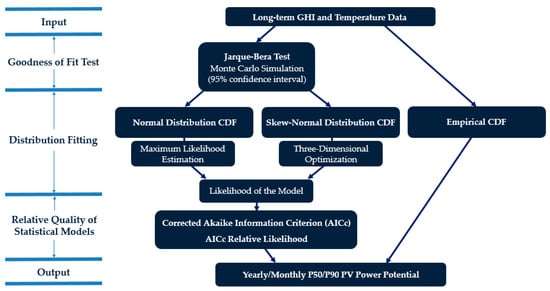 This study determined the best goodness-of-fit distribution when applying the normal, skew-normal, and empirical distributions based on the long-term solar irradiance database in four major cities in Korea, and compared the results after calculating the P50/P90 PV power potentials. In PVsyst, which has been widely used as a performance simulation program in existing solar energy systems, the normal distribution was assumed for annual solar irradiance data, and the P50/P90 values were calculated from the empirical CDF, whose data were sorted in ascending order based on the assumption that the probability of occurrence of all data was the same when the solar irradiance data did not follow the normal distribution in the existing SAM algorithm. However, this study presented a distribution, which was closer to the actual solar irradiance distribution mathematically, by applying the skew-normal distribution when the solar irradiance data did not follow the normal distribution. The Jarque–Bera test was used as the goodness-of-fit test to determine whether the solar irradiance data followed the normal distribution, while the AICc was used to determine which model produced a better quality result between the normal and skew-normal distributions.