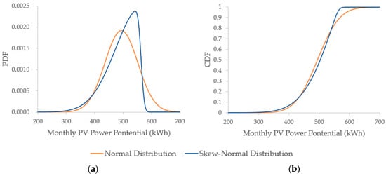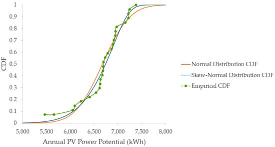 In this paper, four cities in Korea, which is located in the mid-latitude temperate zone and has four distinct seasons (spring, summer, autumn, and winter), were targeted to apply the normal distribution, skew-normal distribution, and empirical cumulative distribution, from which the P50/P90 PV power potential was calculated and the results were compared. The Jarque–Bera test was used as the goodness-of-fit test to determine whether solar irradiance data followed the normal distribution, and the AICc was used to determine which method produced a better result between normal and skew-normal distributions.