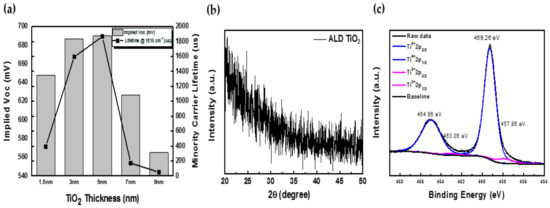 (a) Implied Voc and carrier lifetime data, (b) GIXRD spectra, and (c) Ti 2p XPS spectra of ALD TiO2.