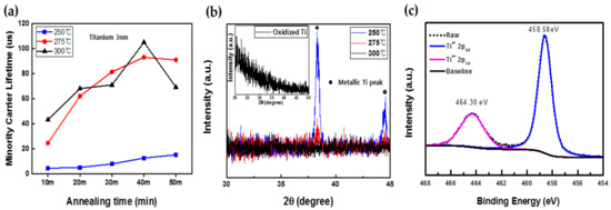 (a) Lifetime according to oxidation temperature and time, (b) GIXRD spectra (inside figure is broader range of GIXRD peak), and (c) Ti 2p XPS spectra of an oxidized titanium layer.