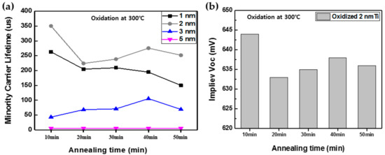 To obtain a high-quality passivation layer with this method, additional experiments were conducted by varying the thickness of the titanium layer using an annealing temperature of 300 °C. As shown in Figure 5a, the carrier lifetime tended to be low after the oxidation if the deposited layer of titanium metal was thick. The longest carrier lifetime at the injection level of 1 × 1015 cm−3 was obtained for the 2 nm titanium layer annealed at 300 °C for 10 min after deposition, and the implied Voc of the layer was 644 mV (Figure 5b). After 20 min of annealing, the carrier lifetime decreased; however, there was no significant change with further heat treatment up to 50 min. With an oxidation temperature above 250°C, the extension of annealing has been reported to contribute to breaking the Si-O-Ti bonding at the interface. Thus, the interface passivation quality could degrade when the annealing time is too long [9]. This trend was similar to that of the 1 nm titanium layer case. Furthermore, for titanium layers with thicknesses more than 5 nm, the lifetime values were low; therefore, it was difficult to confirm meaningful values. During the oxidation process, extra compressive stress was induced at the interface between TiOx and the Si substrate, as the volume of titanium metal deposited on Si substrate expanded [31]. It is expected that the larger residual stress is induced as thicker metal is deposited. The stress could induce the phase transition from the amorphous phase to the anatase phase [32]. In addition, titanium might possibly be left as residual metallic phase without being oxidized, and the stoichiometric composition could be changed during the oxidation when the layer is too thick [33]. The implied Voc results of the oxidized 2 nm titanium layer showed a similar trend as the lifetime data.