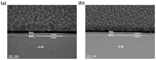 The selected ALD samples formed by the deposition of a 3 nm layer of titanium and subsequent FGA at 350 °C had an implied Voc of ~685 mV. The implied Voc of the sample prepared by the deposition of a 2 nm layer of titanium metal by thermal evaporation and subsequent additional oxidation in a tube furnace at 300 °C was ~644 mV. As shown in Figure 6, the silicon oxide layer grew from ~1.2 nm to (a) 1.59 nm after FGA and to (b) 1.92 nm after the oxidation, respectively. In addition, the initial titanium metal layer, 2 nm thick, grew to 3.49 nm during the oxidation of the titanium oxide layer.