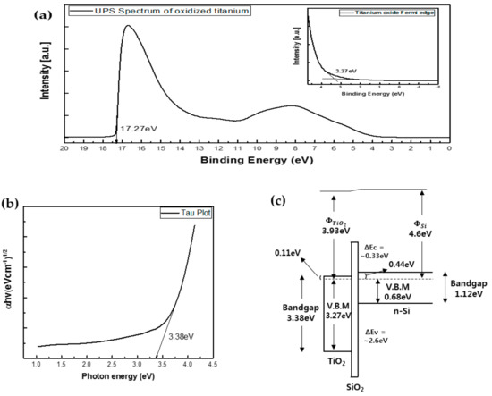 Titanium oxide is used as an electron-selective layer because of the small band offset (less than 0.5 eV) in the conduction band when applied to n-type silicon [9]. Because the bandgap and work function depend on the film formation method and composition, UPS and UV–vis spectroscopy measurements were performed to observe the band alignment of titanium oxide formed by the thermal evaporation method. Figure 7a shows the UPS profile of the oxidized titanium layer. The work function of the layer (ΦTiO2) was determined from the secondary electron cutoff edge (Evacuum) using an equation related to the photon energy (Φ = hv − (Evacuum – Efermi)). From the data in Figure 7a, the work function was determined to be 3.93 eV (ΦTiO2 = 21.2 − (17.27 – 0)). The valence band maximum (EV) was also determined from Figure 7a and was found to be 3.27 eV below Efermi. The above values were similar to those of other groups studying the electronic and optical properties of titanium oxide [30,34]. The work function (4.6 eV) and valence band maximum (0.68 eV) values of the silicon wafers obtained by UPS measurement with a room temperature silicon band gap of 1.12eV were also similar to those reported in the literature [35]. In addition, the optical gap (~3.38 eV), the band gap of titanium oxide is about 3.0~3.4 eV depending on the crystal structure [36], was determined from the UV–vis absorption spectrum of titanium oxide (10nm of titanium was deposited and oxidized on the glass) using a Tauc plot, as shown in Figure 7b [37]. Based on these data, we were able to confirm the band alignment when titanium oxide was deposited on the silicon substrate through thermal evaporation, as shown in Figure 7c. The ΔEV and ΔEC values for the n-Si/TiO2 interface were ~2.6 and ~0.33 eV, respectively. From the results of the energy band structure, although further optimization should be needed, the oxidized titanium layer can be an effective candidate of the electron-selective contact material for silicon.