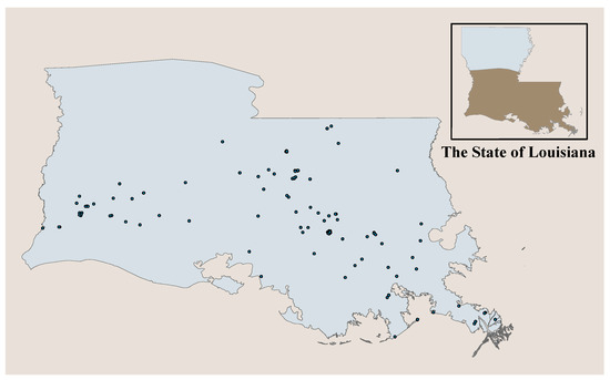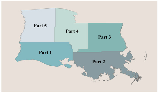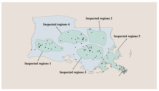 The analyses in this paper were based on the southern part of the pipeline network in Louisiana state. It is defined as the observation window , whose area was approximately 98,883.802 km2. A total of 138 failure events across the observation window from January 2010 to January 2017 were analyzed. Their spatial distributions are shown in Figure 2. The data for failure events were provided by The Pipeline and Hazardous Materials Safety Administration (PHMSA). These data include the observed location of each failure event, the date that the failure event occurred, and the total cost of each failure event. In this case study, five inspected regions were established, and these regions were identified in Figure 5. Our approach was applied to evaluate the risk of each inspected region and then to identify the most critical one.