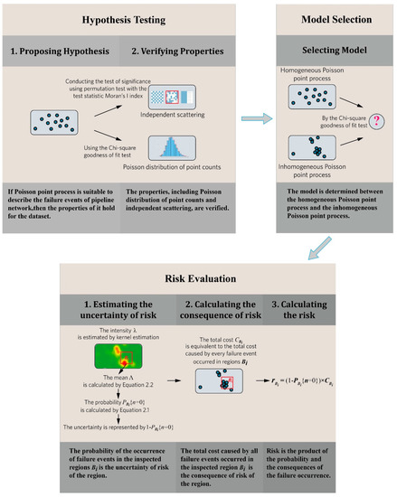 The proposed approach includes three procedures: hypothesis testing, the model selection, and risk evaluation, which are shown in Figure 3. First, the reported locations of failure events in the observed window are processed using the GIS software. The aim of hypothesis testing was to validate the availability of the proposed approach. In this procedure, a hypothesis was proposed, which stated that the Poisson point process was a suitable model for the dataset of pipeline failure events. This hypothesis was tested based on the processed data. In the procedure of model selection, our approach was to determine the inhomogeneous Poisson point process or the homogeneous process to be used as the model for modeling the dataset. After that, the risks of the different inspected regions were assessed. The intensity of the chosen model was first estimated, which is the foundation for estimating the uncertainty of risk in different inspected regions. Then the consequence of risk in different inspected regions was calculated.