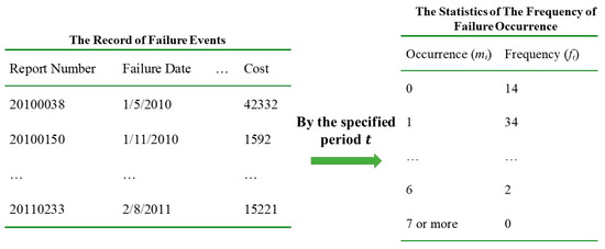 Before the conduction of the first test, period must be determined, and should be considered with the inspected interval time. After that, the frequency of failure occurrence (henceforth referred to as the sample data) in the given period is obtained based on the records of the failure events. This process is illustrated in Figure 4. Then, the chi-square goodness of fit test can be implemented.