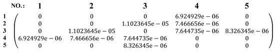 After the verification above, the property independent scattering was verified. Two groups of counts, originating from the inspected regions of the pipeline network and all districts obtained by the division of the observed window, are listed in Table 3. The spatial weight matrix of the inspected regions was created based on the threshold distance 144,420.2535 m, which is shown in Figure 7. The spatial weight matrix of all districts was created with a threshold distance 137,697.5568 m, which is shown in Figure 8. These test results are summarized in Table 4. All the results clearly indicate that we could not reject the null hypothesis. Therefore, we accepted that the property of independent scattering was retained in the two groups of counts.