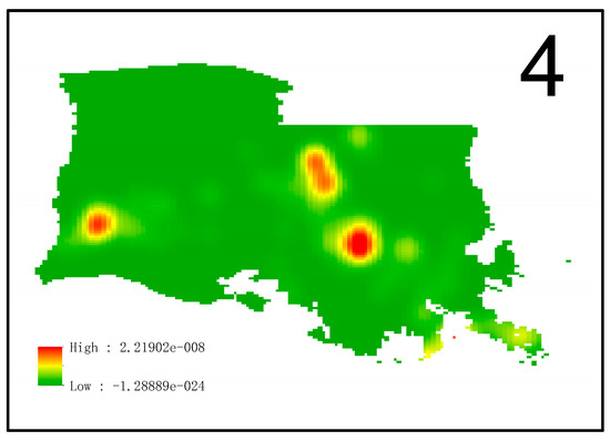 After model selection, the inhomogeneous Poisson point process was determined to be the model for the spatial point pattern of pipeline failure events. Then, the intensity of the observed window was estimated through kernel estimation with a bandwidth of 11.59267 km, and the result is illustrated in Figure 9. In Figure 9, different colors are measures of intensity in different spatial location, which reflect the number of failure events occurred per square meter. Based on this intensity, the probabilities of the failure events in each inspected region were estimated.