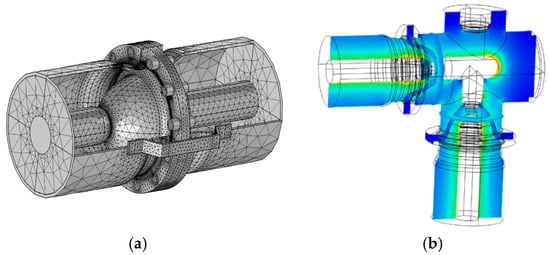 To demonstrate the use of FEA for GIS components, the bus-spacer intersection and 90° elbow models, shown in Figure 1, were created using the RF module of COMSOL Multiphysics® (Burlington, MA, USA) []. Insulating spacers provide mechanical support to the HV conductor and can provide a gas tight partition between gas zones.