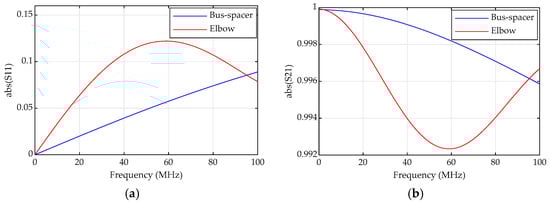 Bus-spacer and elbow scattering parameters (S-parameters): (a) S11 (reflectance); and (b) S21 (transmittance).