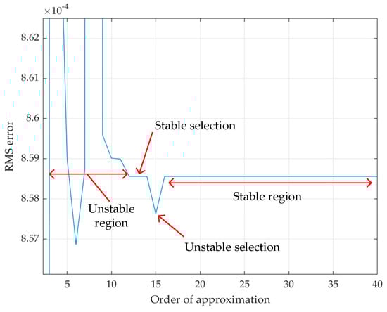 It is possible to estimate a suitable order of approximation from the number of resonance peaks present in the response. While this approach can result in a satisfactory fit, it was found for some fitting orders, various degrees of instability occurred for the time domain responses, even after pre-fitting the S-parameters and enforcing passivity. While limited by the number of frequencies present in the input data [], a high order approximation, in most cases, provides reasonable results. However, intermittent higher order bands of instability were observed. In addition, including multiple high order circuit equivalents in EMTP becomes computationally demanding, with program limits being exceeded for a standard solver configuration. A trial and error approach for stability assessment, identifying an equivalent circuit for each order of approximation over a wide range and each time assessing the stability by transient simulation, would eventually identify stable solutions. This approach would require an excessive amount of effort as each order of approximation would need to be compared for each fitting option, i.e., every combination of order, weighting and treatment of the constant and proportional terms. Another simple but seemingly effective option was identified by observing the apparently converging behaviour of the root mean square (RMS) error between pre-fit and post-fit admittance matrices. Figure 4 demonstrates that as the model order is increased, the RMS error deviation converges to a more stable value. Comparison of individual error terms with the error at the asymptote allows identification of the minimum order of approximation for a stable transient solution and unstable order selections, as given by Equation (20):