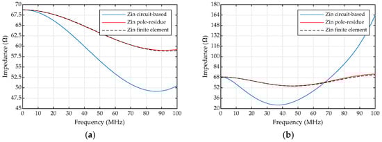 The VF toolbox created by Gustavsen et al. [,,] for MATLAB was used to derive a rational approximation for a set of frequency-dependent matrices. The toolbox requires specification of an initial pole type; for both the bus-spacer and elbow models, linearly spaced, complex poles were chosen. After specifying the initial pole type, the poles are iteratively relocated to achieve a better fit. Once the poles are obtained, the residues of Equation (9) are computed as a linear least-squares problem. In the frequency domain, the accuracy of the fitted response for both components is high. However, a good time domain solution is more difficult to attain, as stability, passivity and causality must be preserved. The stability of the solution is partially enforced during iterations, by flipping unstable (positive) poles to the left half of the complex plane []. While stable poles are assured, this does not guarantee a stable time domain response, as instability can result due to passivity violations. A passive system is one that does not generate energy. Small numerical errors produced by field solvers, noise, non-physical models or even artificially modified results can result in non-passive data []. Passivity is traditionally assessed using a Hamiltonian matrix [], whereby the identification of purely imaginary eigenvalues constitutes a non-passive model. An issue with the Hamiltonian matrix is its size, resulting in excessive computation times for large models. The VF toolbox algorithms utilise one of two slightly different passivity assessment methods. For the assessment of S-parameter models, a half size passivity matrix is constructed, whereby the square root of the matrix eigenvalues are equal to the eigenvalues of the Hamiltonian matrix []. For admittance-based models, a half size singularity test matrix is constructed, which identifies the frequencies at which the conductance matrix becomes singular, thereby identifying bands of non-passivity []. Passivity is then enforced using fast residue perturbation (FRP) [], which perturbs elements of the residue and constant matrices until eigenvalues are greater than zero, while minimising the change to the elements of the admittance matrix. Another stability determining criterion is causality. A non-causal system is one in which a response precedes an input. Causality is a requirement for passivity. Therefore, passivity enforcement should also ensure a causal model [].