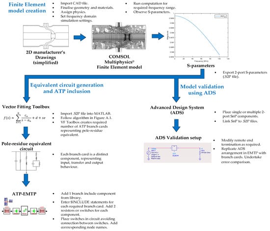 A close match between the pole-residue models and the finite element models implies a good fit in the frequency domain. The behaviour of the circuit-based elbow model differs significantly from both the pole-residue and finite element models. In order to validate the model in the time domain, the equivalent circuit was variously terminated by open/short circuit, a 68.7 Ω resistance (bus ZC), a 434 Ω resistor (maximum OHL ZC) and a capacitive-resistive termination (open disconnector 5 pF capacitor and bus ZC resistor). The validity of the pole-residue model results was assessed by comparison with the results of a transient simulation computed directly with the S-parameters in ADS for the same terminations. An overview of the VF/pole-residue modelling process and ADS comparison is given in Figure 6.