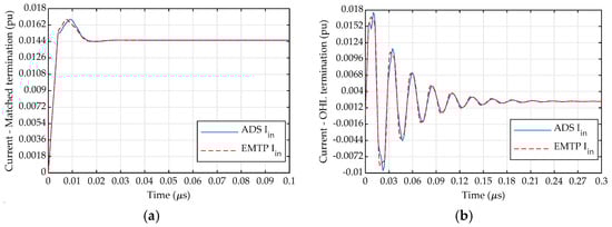 EMTP vs. ADS elbow transient responses showing good agreement for: (a) matched termination; and (b) OHL termination.