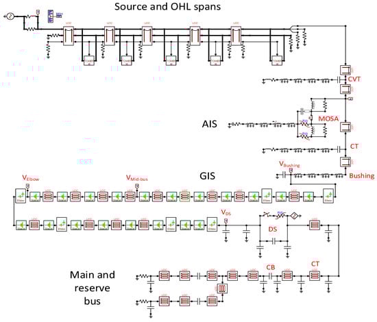 The overall system response when multiple pole-residue equivalent circuits were integrated into a larger circuit was compared against the circuit-based representations in the 400 kV GIS model, for the system shown in Figure 8. Figure 9 provides the overall system diagram for clarification of the switching arrangement. The circuit-based GIS model was created following guidance from [], using the elements shown in Table 3. Parasitic elements were added where required, however, most of the system is modelled by distributed components. Both models are identical, with the exception of the representation of the elbows and bus-spacer elements. For the pole-residue model, a total of nineteen bus-spacer sections and five elbow sections were replaced and reductions were made to the individual lengths of the bus to maintain the correct lengths.