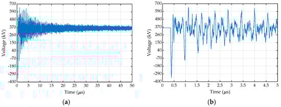 A single VFT was simulated by closing DS-1, shown in Figure 9, represented by a simple exponentially decaying resistance, calculated using Toepler’s spark law []. A 1.1 pu 50 Hz source was used at one side of the disconnector and a −1.1 pu (peak) trapped charge was used at the disconnected side of the bus [] to determine the highest possible magnitude of VFT for the specified circuit representation. The waveforms generated close to the gas to air bushing are shown for both the circuit-based model and pole-residue equivalent circuit in Figure 10 and Figure 11 respectively. A comparison of peak magnitudes at various locations was also made, as given in Table 4.