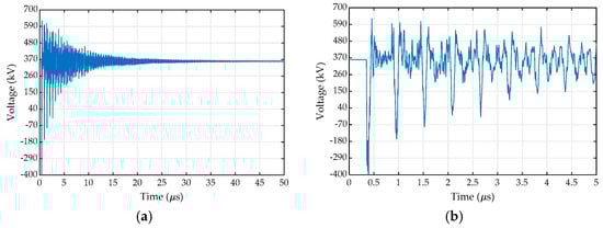 Voltage at gas-air bushing for circuit-based model: (a) 50 μs duration; and (b) magnified 5 μs.