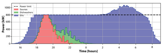 The results of the combined power allocation of the appliances for all houses under the “earliest deadline” allocation can be seen in Figure 5. The power limits are respected globally most of the time, except for the later periods, in which the EVs had to exceed the global power limit because, otherwise, their batteries would not be fully charged at the desired/needed time. This “forced charging” means that under critical conditions, the appliances ignore the dispatch from the aggregator to satisfy their own demands. It is worth noting that, even though the power limit (i.e., the available pool of energy resources for the flexible loads) was set to a constant value, it could have been set to any arbitrary value for each timestep, and the loads would follow it.