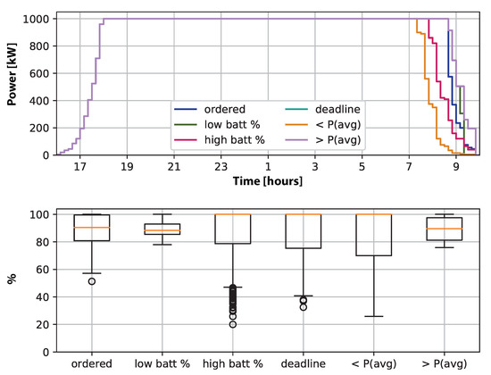 For the “hard limit”, the load profile curves are somewhat similar, but the policies that favor higher battery states (“high battery % first”, “less P first”) reduce the power demand sooner. This is because some of the batteries that were not fully charged went past their deadline, and so they were not available anymore. This is reflected in the boxplot distribution of the final charge levels, where the spread of the battery charge levels is bigger. Conversely, the policies that favor low charge levels (“low battery % first”, “more P first”) reduce this spread, although the median battery level is slightly lower. The “ordered” and “earliest deadline” case fall in between these cases. This indicates that the ordering rule has a strong effect on the quality of service (QoS) experienced by the end users, as evaluated by the charging levels by the individual requested deadlines.