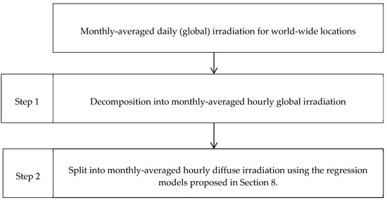 Monthly-averaged hourly values were estimated for the global and diffuse irradiation using the information of each location for the given period of time. A visual basic code was then defined for this purpose. The monthly average hourly diffuse ratio () and the clearness index () were calculated for each location. In order to avoid erroneously recorded data, the conditions below (Equations (49) and (50)) were used. Extraterrestrial irradiation cannot be greater than global irradiation and diffuse irradiation cannot be greater than global irradiation.