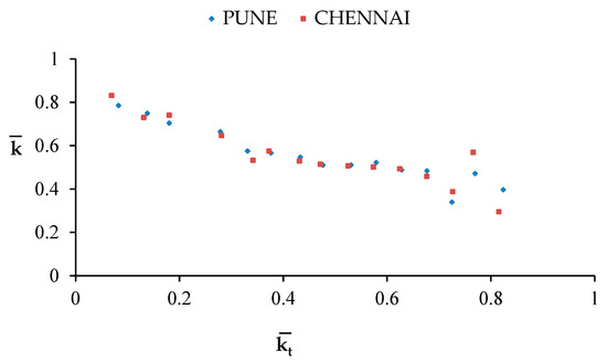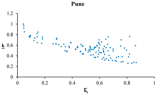 Monthly-averaged hourly kt vs. k for Pune.