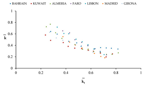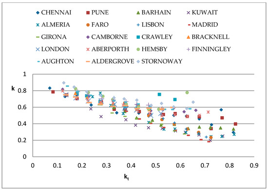 Muneer and Hawas [15] used three years of measurements from 13 Indian stations, all of them between 8.5° N and 28.5° N latitude, to develop regression equations for each individual station as well as for the whole country of India. The regression obtained from the equations (Equation (34)) concluded a high relationship between the k and kt for individual locations (R2 = 0.893−0.95) and also for the whole country of India (R2 = 0.89).