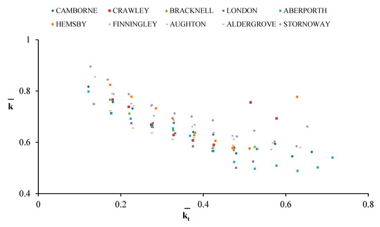 There is an increasing tendency of k in the top end of kt. This fact is especially notorious in the data from the 10 locations of the highest latitude group that are under examination, as can be seen in Figure 10. This phenomenon is related with simultaneous existence of two astronomical/weather-related situations. A more extended explanation of this phenomenon is developed in Muneer et al. [50].